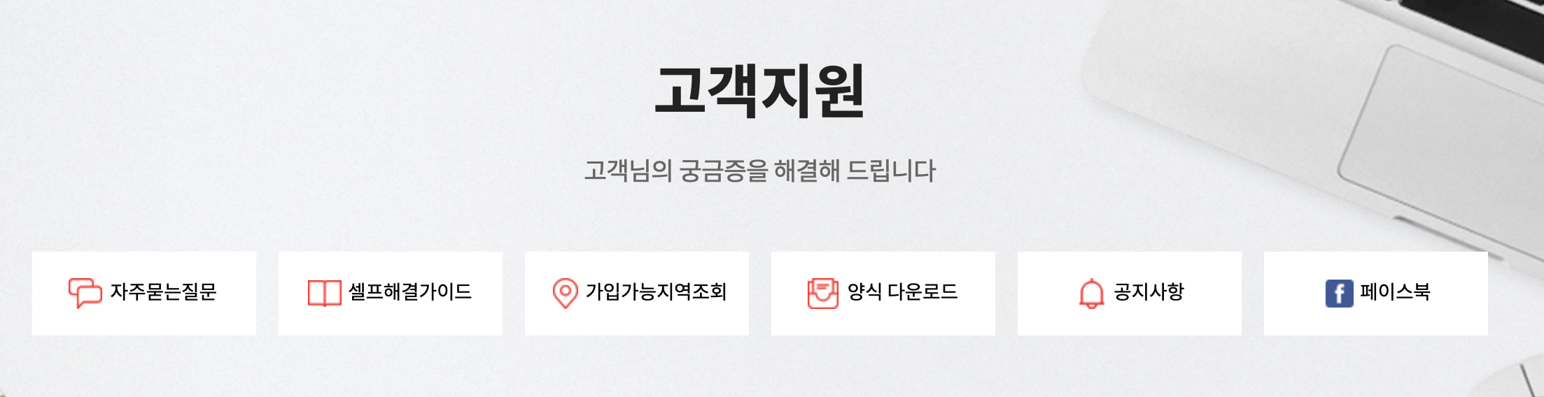 홈페이지 고객지원 메뉴에서는 FAQ와 기술적 장애를 해결할 수 있는 셀프해결가이드 등의 메뉴를 이용할 수 있으며, 아래의 링크를 따라 들어가면 바로 확인 가능합니다.