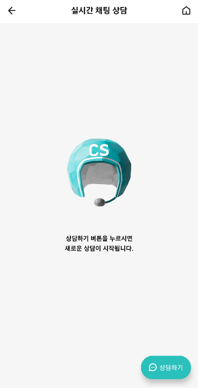 상단의 고객센터로 들어가신 이후 실시간 채팅을 선택하면 위와 같은 화면으로 진행합니다. 상담하기 버튼을 선택한 후 문의사항을 남기면 배달의 민족 상담사가 안내를 도와줍니다.