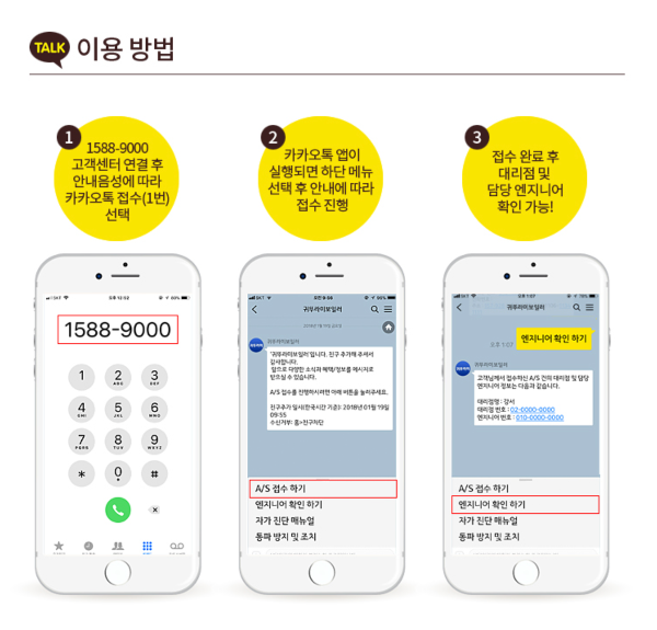 두번째, 스마트폰의 카카오 톡을 통해서도 쉽게 문의할 수 있습니다. 아래 이용방법을 참고하여 AS접수를 진행해보시면 됩니다.