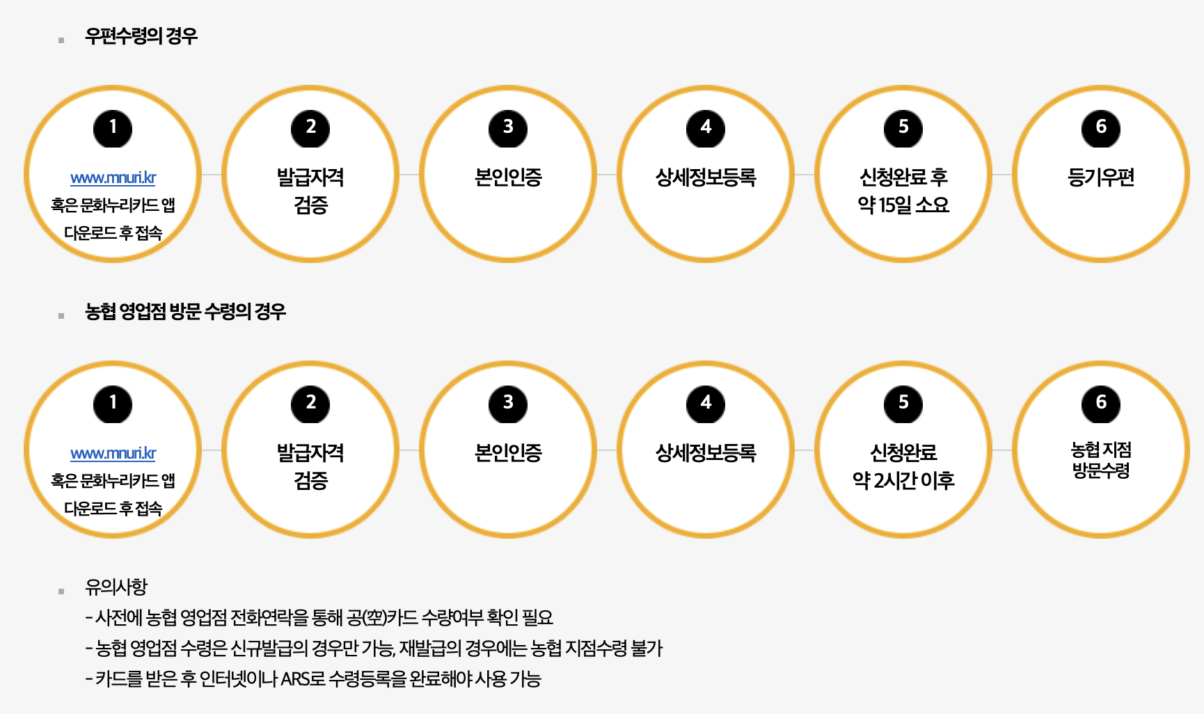 온라인 발급은 문화누리카드 누리집에서 이용약관에 동의하고, 본인인증을 거친 후, 신청정보를 입력하고 신청서를 제출하면 됩니다. 온라인 신청 시에는 우편수령 또는 농협 영업점 방문 수령을 선택할 수 있으며, 우편수령의 경우 등기우편 발송으로 1~2주가 소요됩니다. 농협 영업점 방문 수령의 경우 영업점 카드 보유여부를 확인하고, 신청 2시간 후 방문 요청하면 됩니다. 자세한 사항은 아래 홈페이지 링크를 따라 들어가 확인하시면 됩니다.