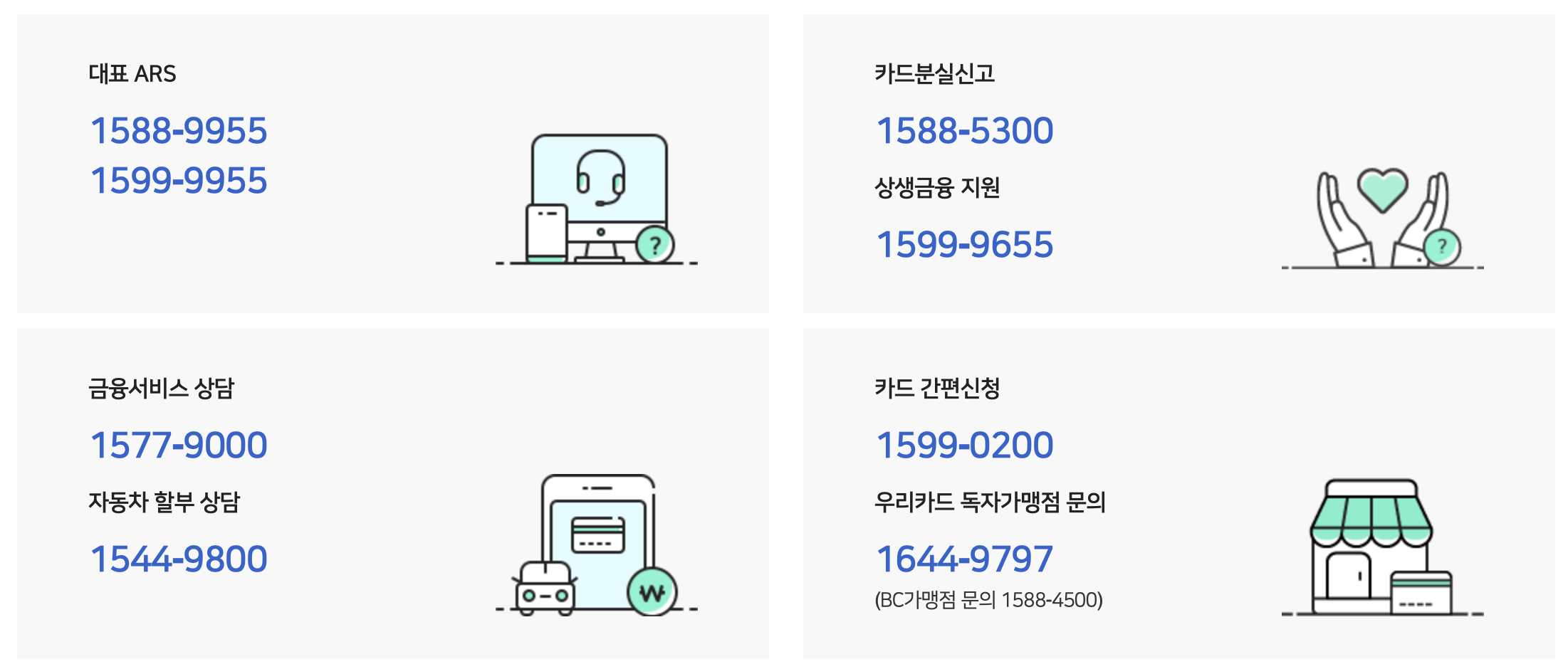 오늘은 우리카드 고객센터로 연락하는 방법에 대해 적어보겠습니다. 카드 발급이나, 재발급, 종류나 한도를 변경하는 것들은 그렇게까지 급하지는 않을 수 있으나 카드 분실이나 비밀번호 오류에 의한 결제 제한, 카드값 미납으로 연체가 발생해 신용정보에 불이익이 갈 수 있는 상황에서 급하게 연락이 필요할 때 우리카드 고객센터로 문의하시면 됩니다.